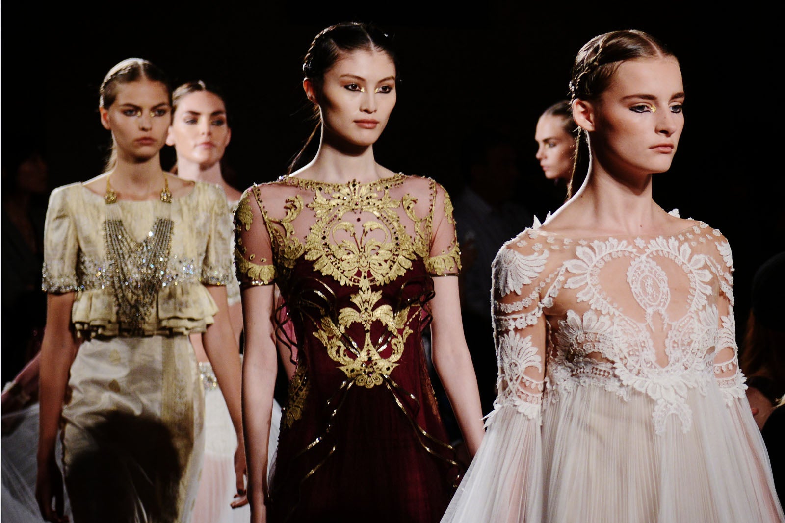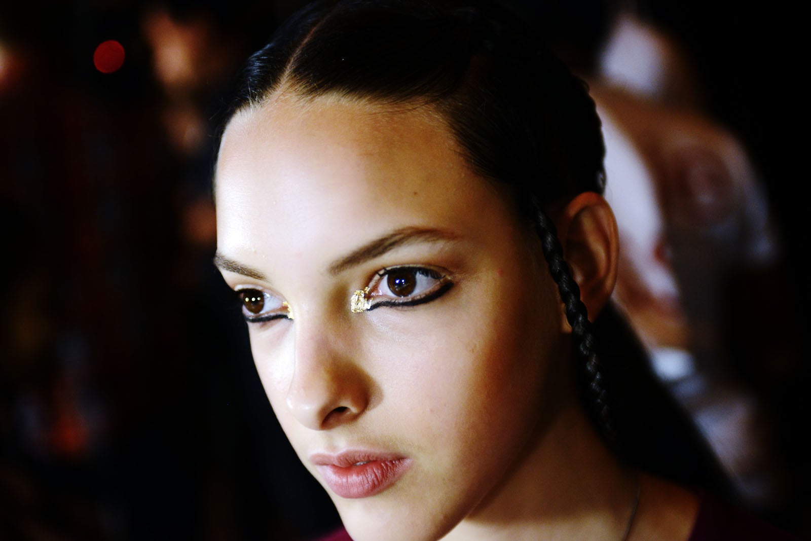 Talia Shobrook started the makeup look with the perfect canvas: a moisturized and gently illuminated complexion. The focus of the makeup look was the Indian-inspired eye accented with gold leaf, which Shobrook said was meant to highlight the opulence of the collection. Shobrook created a "modern" kohl-lined eye with Tightline Cake Eye Liner in Black Ebony and finished with a coat of Long Lash Mascara in Black. Finally, pieces of gold leaf were placed at the corners of the eye for that exotic, swoon-worthy bit of flash. Topping it all off was a light coat of Hydratint in Mocha Tint — the perfect bare nude to keep the focus on the models' fierce stares.