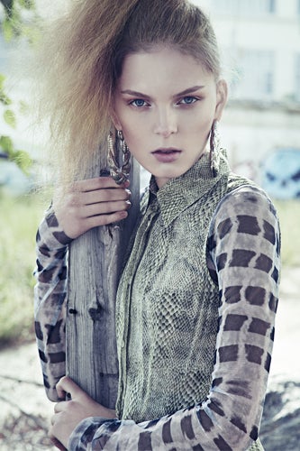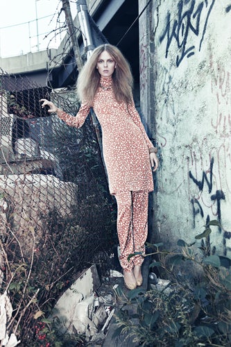 We're crazy for Kathryn Typaldos' (who we also revere for her work in W and Nylon, to name a few) styling in the featured project, conceptualized as a mix of high/low, runway/thrift, and what they're calling "tough grandma." Featuring model Kate Kosushkina, we invite you to lust over the soft looks set against barren backgrounds in six snaps you'll see here first.Photographed by Tom Hines