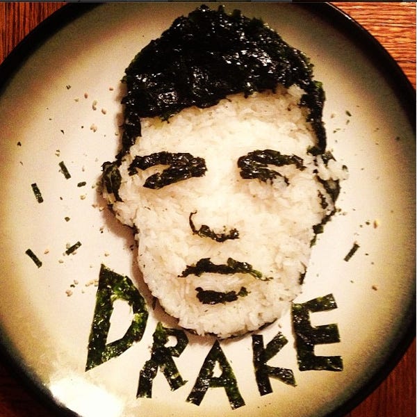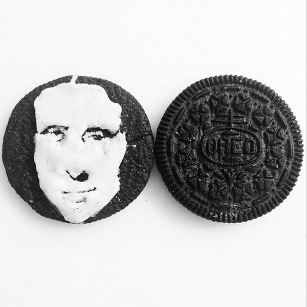 You've seen art on the streets. Well, now get ready for #ArtintheEats. It's a hashtag project started by the mysterious New Jersey-based @tishacherry. When we stumbled across her work in the French magazine Fricote, our jaws dropped a little. It's pop culture meets puns meets pretzels. The nurse by day, artist by night finds daily fun in creating mini masterpieces with everything from strawberries to sushi to Cookie Butter (which is a thing and we're freaking out a little). The subject matter? Rappers, characters from The Simpsons, and fashion labels. Right? So good.