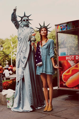 Eating a soft pretzel from a street vendor, posing with the "Statue of Liberty," walking several dogs down an undoubtedly crowded sidewalk— only Karlie Kloss can commit these New York faux pas while still looking fab. And, okay fine, it ain't a crime to indulge in the city's most famous attractions, but clogging sidewalks and gratuitously posing is a lot more forgivable when you look that good. In this half of Free People's East meets (or vs.?) West Coast lookbook, Kloss looks stunning in short-shorts, a white eyelet dress, and a sheer polka-dot frock, to name just a photo-op-worthy pieces we want. Plus, we're really into that multiple-braid thing she's doing underneath her wide-brimmed hats. Tourist or local, we'd def turn heads as she walked down the street.