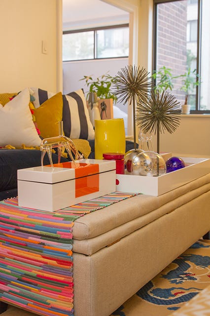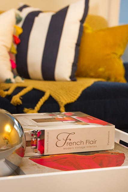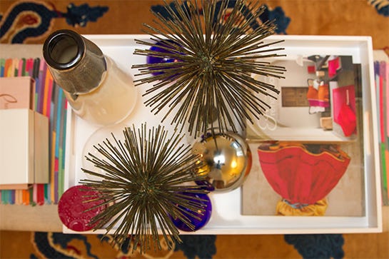 Color was a major factor in everything from the pillows and throw to the vases, the table runner, as well as the coffee table books. She incorporated texture using glass, a mix of metals, and fabrics.