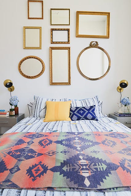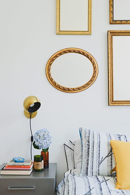 Will loves working with high ceiling spaces because he gets to experiment with moving items off the floor and onto the walls. A gallery wall of framed mirrors hangs in the bedroom, the ceiling was painted dark gray and a hanging strategy for the couple’s existing art let them fall in love with their collection all over again. With space but no need for an in-home office, Will transformed the extra room into a very cozy cool lounge area by adding a daybed and stringing One Forty Three from the ceiling.