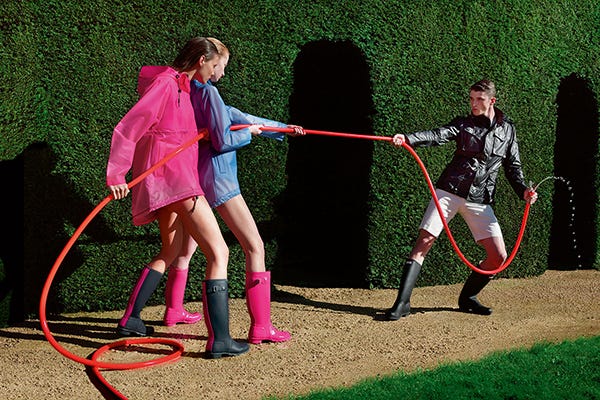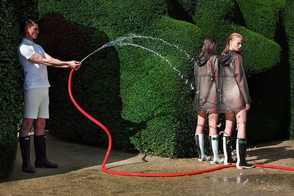 Given what an utterly miserable, polar-vortex-filled winter it's been, you can be forgiven for seeking a little escapism. And, since spending your 9-to-5 time researching getaways in Cabo may not be the best way to endear yourself to the boss, we have a much more manageable vacay for you instead. Hunter' newest campaign is a journey to a verdant spring day — and the fact that it depicts minimally clothed models splashing around with water hoses certainly doesn't hurt when it comes to getting us in the warm-weather mood.