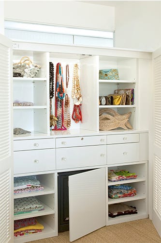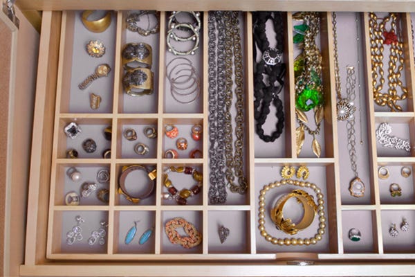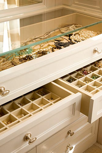 Another great way to store your family jewels is in felt-lined trays. Whether you have splashy costume baubles or exquisite five-carat diamonds, setting up a segregated drawer for your precious cargo keeps your necklaces and bracelets and earrings separate and will make accessorizing much simpler. Also, say goodbye to scratches and tangles.