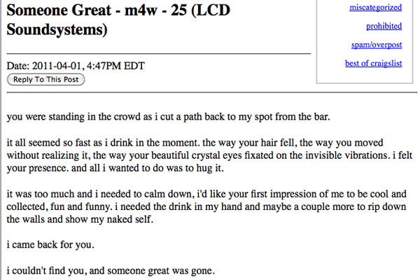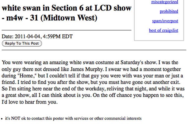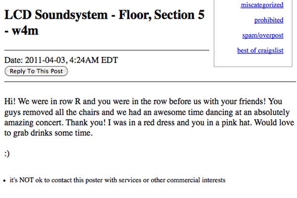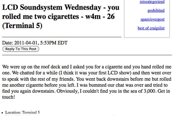 Yes, friends, James Murphy has trundled off the stage as LCD Soundsystem for the last time. Tears. But, as they say, whenever God closes a door, he opens a window—or fills a horny hipster's heart with love, whichever comes first. As Flavorwire noticed, Craigslist's local Missed Connections section has been bubbling with entries relating to the last few LCD Soundsystem shows at Terminal 5 and the momentary exchanges of anonymous desire that those farewell concerts helped cause. So, because we're suckers for love and, more importantly, suckers for a good laugh, here are the best of the Missed Connections coming out of those shows. Read carefully, concert goers—your true love could be looking for you.