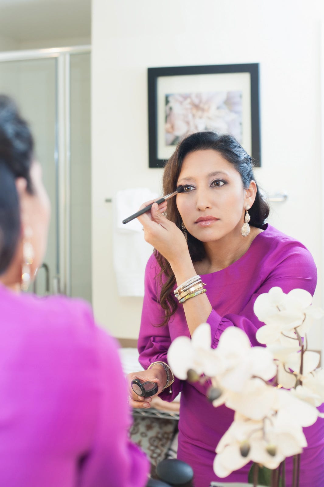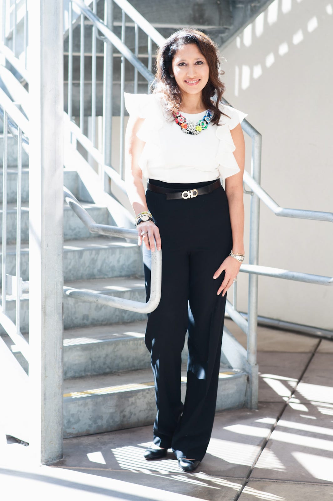 Take the local tech scribe, Leena Rao of TechCrunch. Known for rocking eye-catching color like no other, this stunner’s beauty beams through while reporting on the movers and shakers of Silicon Valley. Pulling makeup inspiration from the most famous — and pretty high-maintenance — TV family (here’s a hint: she’s one-half of Kimye), this natural beaut takes us through the prized products in her bag while handing over a few secrets, from tips for flawless skin to how she plays up her best features.