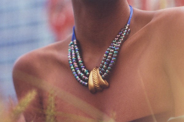 The result? We see this world view (literally) animating her latest lookbook: New York meets international. From frame to frame, a model flits between unfamiliar backdrops to city settings, all the while sporting a range of jewels, from regalia-inspired feather collars to chunky cloth chokers. At the end of this well-traveled flip-book, not only do we feel like booking a flight, we also feel like shopping. How's that for jet set?