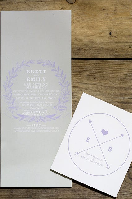 Emily Picano and Brett McDermott married in their hometown of Calgary, Alberta. The Canadian duo exchanged their I dos on August 24, 2013, during an intimate celebration that had some whimsical, romantic, and natural touches. Starting with a short ceremony in an antiques store and followed by a reception in an old warehouse space next door, the celebration concluded with dancing and desserts until the wee hours of the morning.