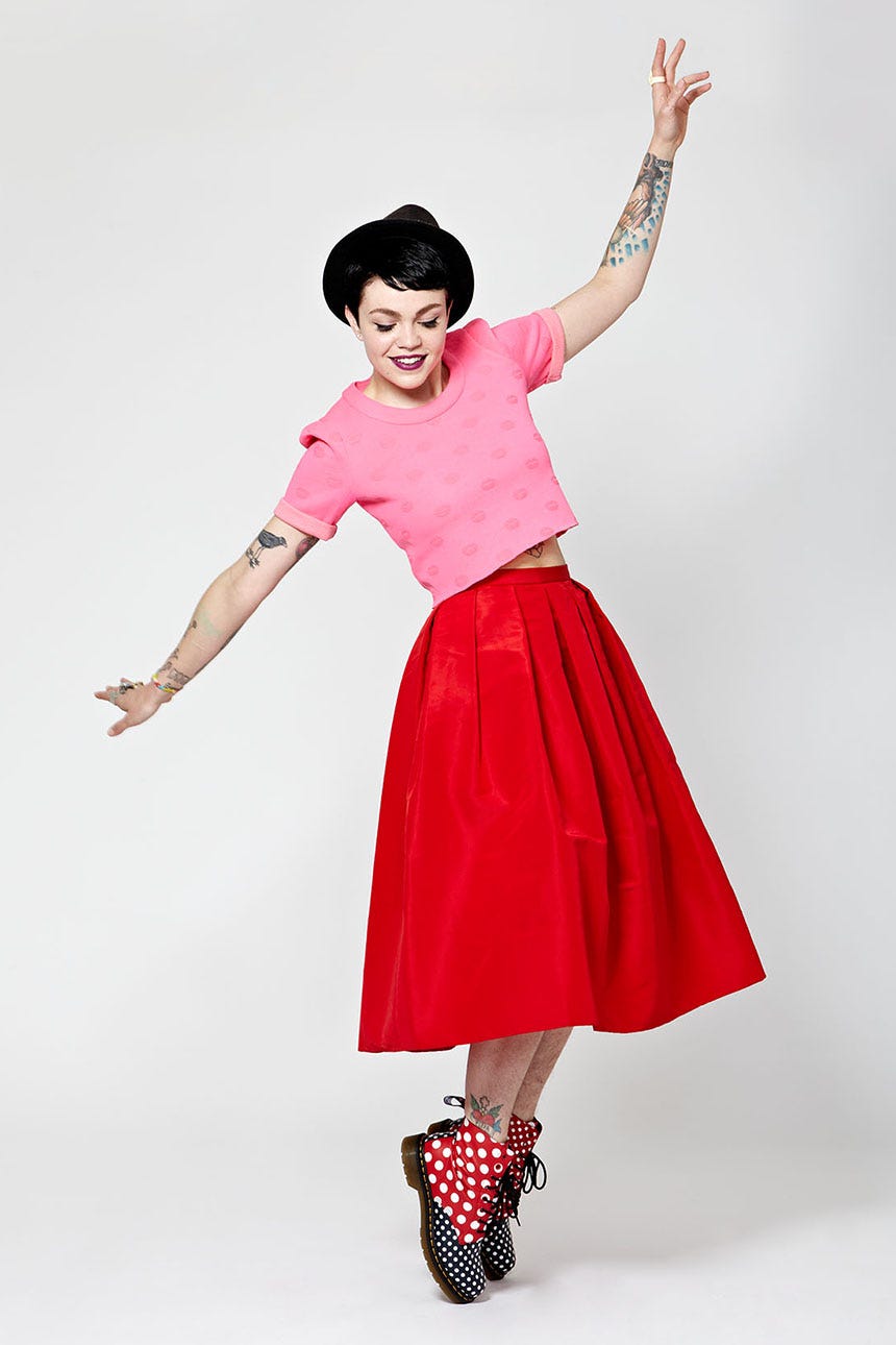 Leila Shams Scuba Sweatshirt Puff Print in Pink Lips; Tibi Red Taffeta Skirt, $475, available at Tibi; Dr. Martens Polka Dot Boots, $130, available at Dr. Martens; Hat, Meredith's own.