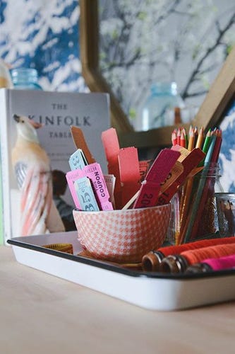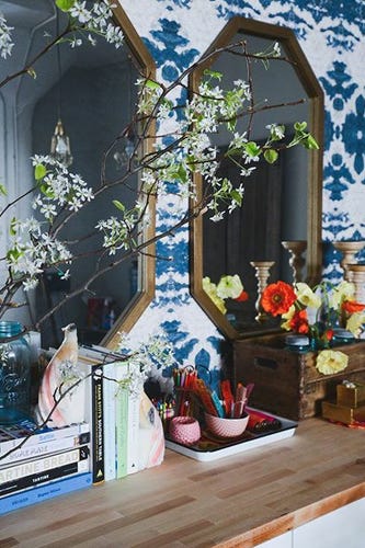 D*S founder, Grace Bonney, knew that she wanted a multi-use area where she and her team could have lunch and host meetings but also get messy with craft projects for the site. After rearranging some furniture, adding the wallpaper, and overhauling what was essentially a storage corner, Design*Sponge can now confidently say they have all of the above — and more, if you add Cupcake and Cookie Area to the list.