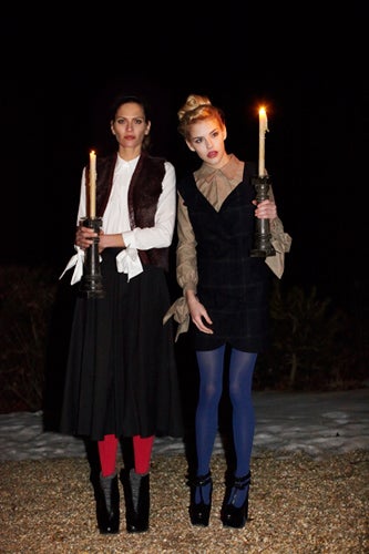 Opening Ceremony utilizes pops of color to make even laundry day look like a glam-fest in its fall '11 lookbook. Starring models Frankie Rayder and Ashley Smith, the pics were shot by Theo Wenner against a stark and oh-so-chilly Amagansett backdrop. Cozy cropped sweaters, high-waisted wool pants, bright tights, and pretty wintery heavy dresses and skirts round out this collection. With a few tartan plaid pieces thrown in for good measure, we can't wait to get our hands on this merch when the cold weather comes around again (hello tromping around on a snowy beach!). With timeless silhouettes and neutral base tones with bits of color thrown in for personal flair, you'll look like a classic lady doing just about anything in these clothes—though if you get that dressed up for laundry, we're scared.