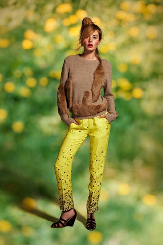 Opening Ceremony's inaugural resort collection features an item that might make you wonder if you've been transported into another fashion Wonderland, specifically the rabbit sweater that—unlike the ubiquitous animal sweaters seen at Givenchy and Balenciaga—actually features bits of real rabbit attached to it. Some Alices out there might feel a little queasy at this particular concoction, but there are many other pieces that will have you ready for any occasion, whether a tea party with a Mad Hatter or a croquet match with the Queen. Check out the full lookbook shot by Tim Barber, below.