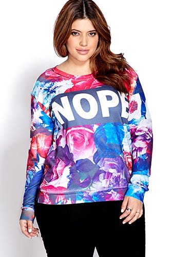 One of the most pleasantly surprising trends of the season has been the sweatshirt. No longer relegated to workouts or days spent nursing a cold (or a hangover), they’ve taken on a new persona — one of quirkiness, emblazoned with prints and sprinkled with bling. But, to our frustration, like so many areas of plus-size fashion, the selection is iffy, if not painfully bland. So, we hunted down a few of our absolute favorites that don't sacrifice any style for comfort. Besides, with designs up to size 28, there's no reason to sit this trend out.