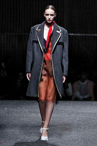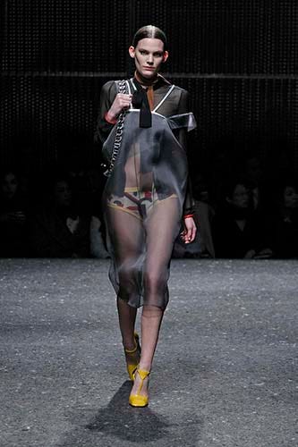 While a clashing of prints, oversized silhouettes, and layered fabrics bring to mind the erratic aesthetic of a child playing through her parents' closet, there was nothing arbitrary about Prada's mix. But — importantly — nothing childlike, either. Slinky, bright dresses peeking beneath large, printed coats seem thrown-on-in-a-hurry perfect. Deep, deep V-neck sweaters over knee-length dresses look unexpectedly coordinated, and also stand out for their singular wearability. Finally, graphic-printed underwear visible beneath long, sheer dresses made for a surprising change from the sexy underthings (or, no underthings) we've seen on other runways this time around. While Prada's version of sexy has never been the overt kind, this collection proves that each of Miuccia's pieces not only celebrates the woman who wears it, but also her unique strategy for piling it all on.