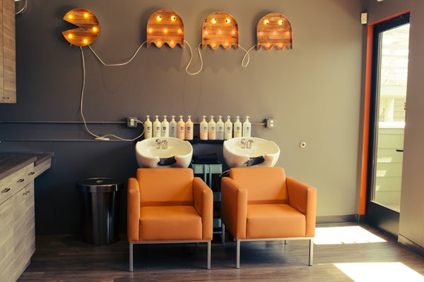 The pair's master vision came to fruition last November, when they opened up their space, which is filled with natural light, modern furniture, iPads to surf for hair inspiration, an enviable stack of cool fashion magazines (for visiting parents), an in-house hair-care line, and cool art all over the place (we love the Pacman light structure above the shampoo station, and the pieces by local students that sprinkle the other walls).