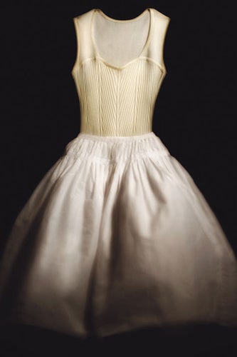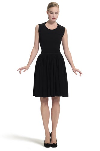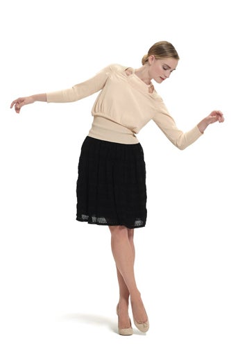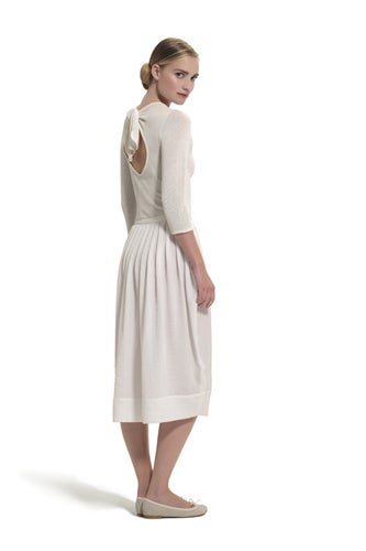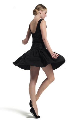 Repetto's 18-piece collection, titled "La Garde-Robe Repetto" (or "The Repetto Wardrobe" for us 'mericans), was designed by Rodier artistic director Emilie Luc-Duc. Only one piece has been unveiled so far, a beautiful tutu-style gown with a stretch bodice and a gathered, gauzy skirt, but the ballet influence is clear. As raw as undergarments but as beautiful as a dance costume, this dress hits all the right Repetto notes: simple, graceful, whimsical, and practical. The collection will be available in Repetto stores on December 5. (Vogue Paris)