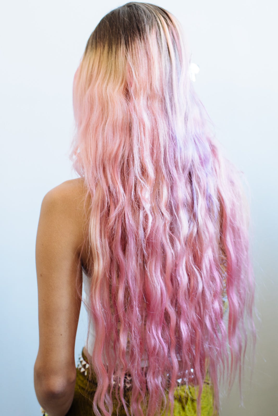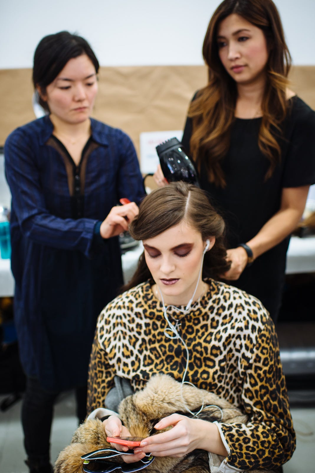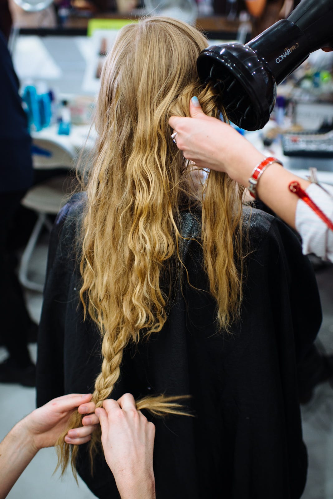 Refreshingly, the hair was probably the simplest of the season. Working with John Frieda, Gilbert added extensions to create the needed mid-back length and spritzed hair with Frizz-Ease Daily Nourishment Leave-In Conditioner Spray to coat and dampen each strand. She then separated hair into two even sections and braided each into a thick pigtail braid. Next, models were sent off to makeup to allow the hair to dry.