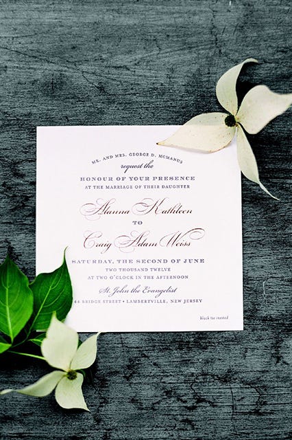 After a Catholic mass at a historic stone church in New Jersey, the newlyweds and their 180 guests drove right across the Delaware River to a restored barn in Bucks County, Pennsylvania, where the bride grew up. “We wanted it to be a special event for people, but still fun and laid-back, because that’s us,” says Alanna of the black-tie affair.