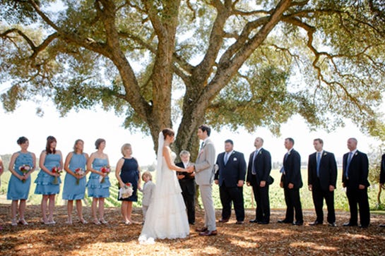 The rustic California setting meant they didn't need much decor, and they kept things simple by incorporating items from the venue (like an old wheelbarrow and a gardener's bench). The bride said the most special moments of the day happened right after they exchanged vows. Even though the groom's father had to miss the wedding due to serious health issues, they had a laptop ready so they could Skype with him immediately after they walked down the aisle as husband and wife.