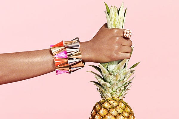 Pulling inspiration from modern art as well, the brass bits and baubles spring to life in the snaps ahead. Sure, pineapples and heavy-metal cuffs don't always go hand in hand, but we're willing to bet they look just as sweet together as they do apart. Ahead, see all of the major eye candy, and shop the jewels — ranging from $100 to $950 — at Shopbop, Anthropologie, Henri Bendel, and Saks Fifth Avenue this spring.