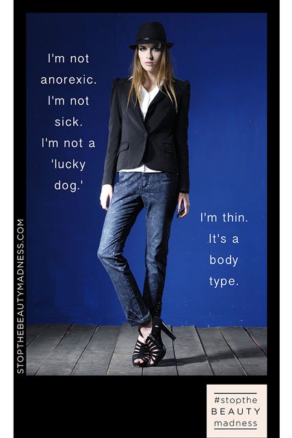 The campaign contains a series of 25 advertisements that are all "branded" with messages that speak to what is actually going on in the photos. "I am not anorexic. I am not sick. I'm not a 'lucky dog,'" reads one photo of a slender model. "I'm thin. It's a body type." Another is a photo of a woman with the ever-present "thigh gap" with the words "my worth" stuck between them.