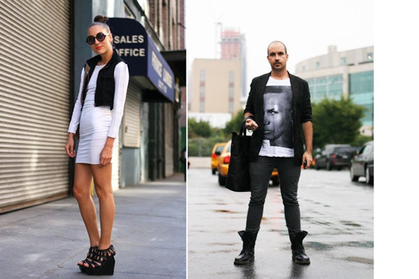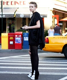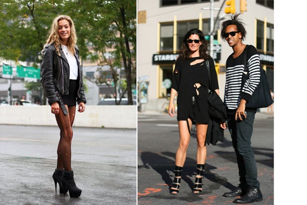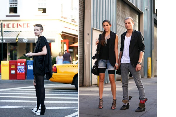 It might have been 80 degrees yesterday, but that didn't stop many show revelers from cloaking themselves in some serious attitude. Outside Rad Hourani and a few other shows, we managed to snap teems of tough, edgy attendees, keeping their cool with soaring black platforms, shredded ebony jeans, and a look that was right on the edge.