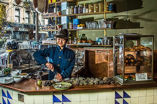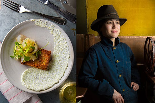 Camille Becerra is a stylist as well as a cook. She's created a beautiful world on Sullivan Street where the trout en croƻte ($34) wears a jacket of puff pastry with its collar popped (and needs only a pale green pool of lemony sorrel sauce to accessorize).