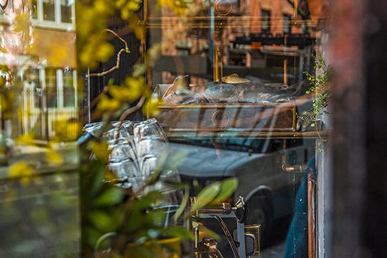 Moments before the evening rush at Navy, handsome, serious-looking men at the bar swirl their glasses of red wine, seriously. A woman reads a book (a real book!) as the last of the evening light filters through a patchwork of Japanese indigos. In a corner of this tiny dining room, someone is opening oysters.