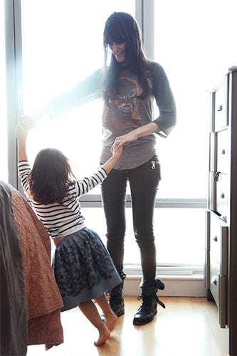Meredith Kahn is the genius behind highly-coveted jewelry and handbag line, Made Her Think. Her long list of devoted fans flock to her collection for a dose of hard-edged femininity (think double-knuckle rings made of rose gold and diamonds). The designer, four months pregnant with her second child, invites us into her light-filled Brooklyn apartment, while daughter Grayson plays hostess. The bilingual three-year-old shows us her ballet moves, while helping mom prepare heart-shaped eggs.