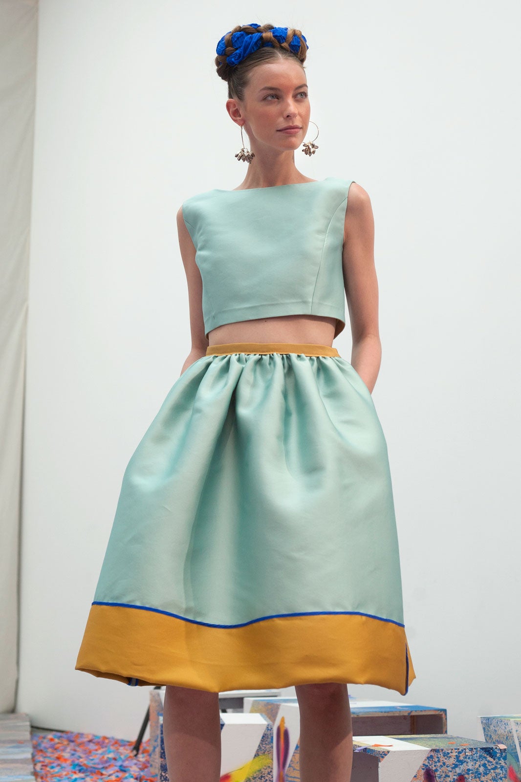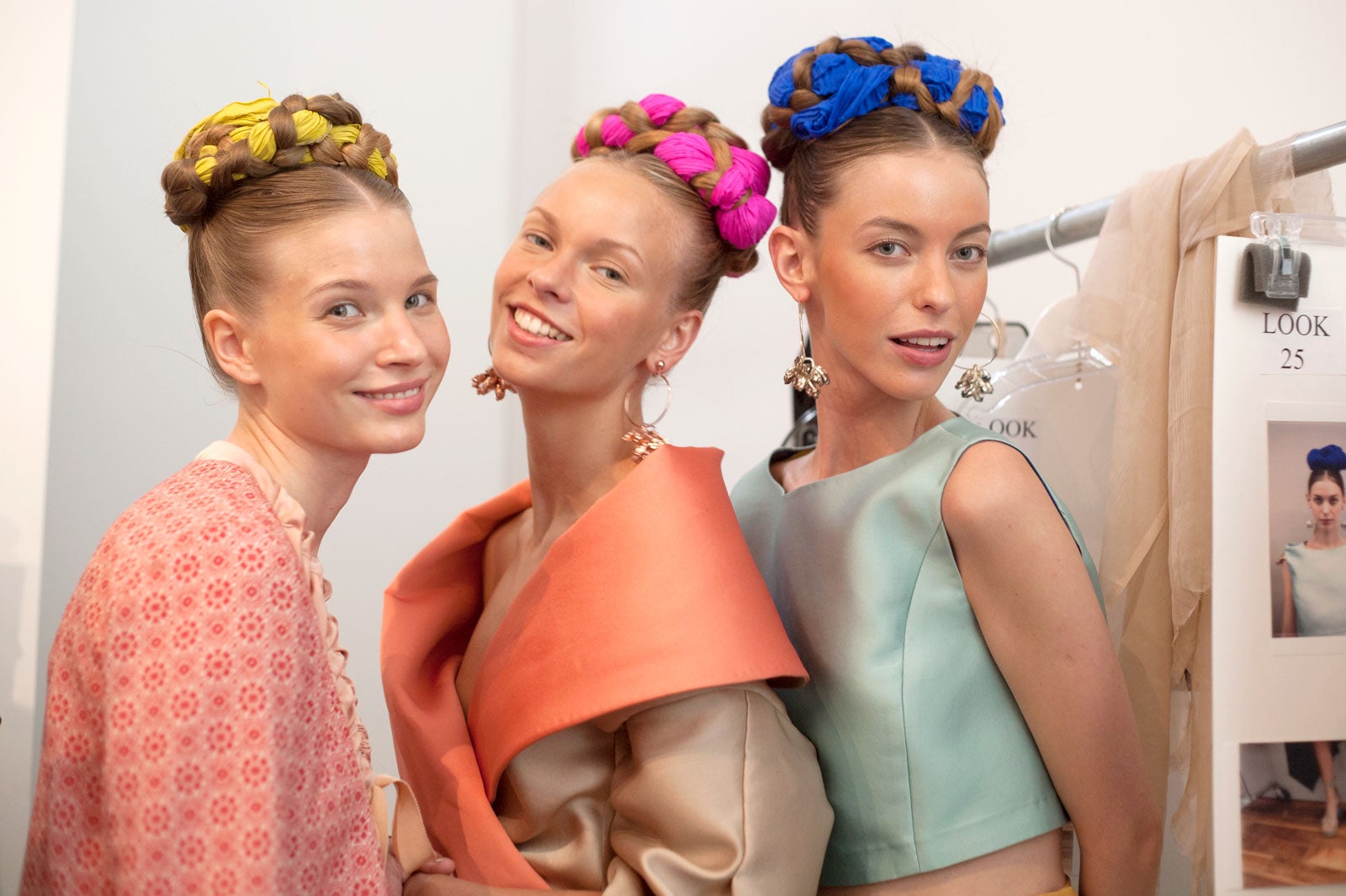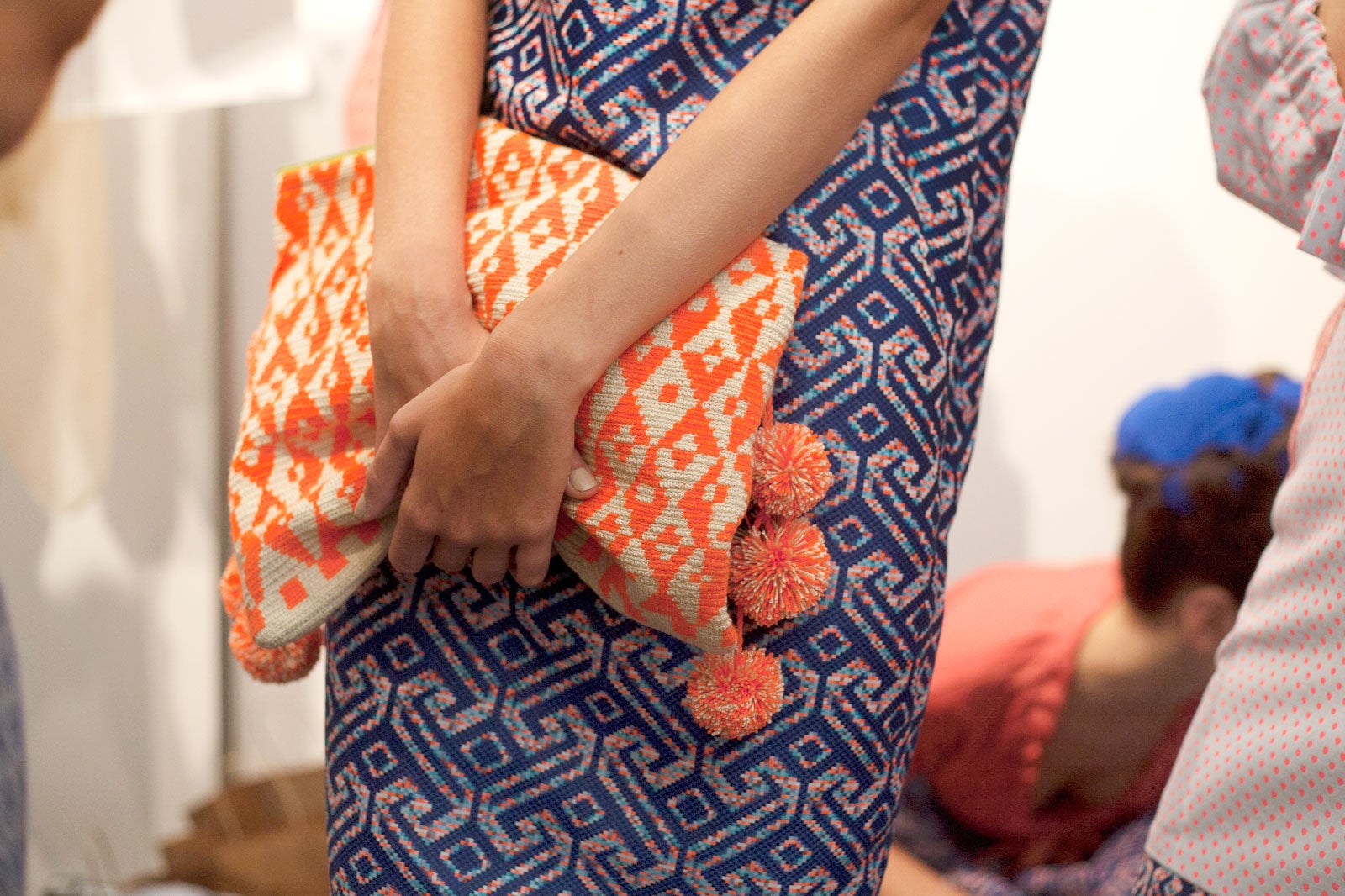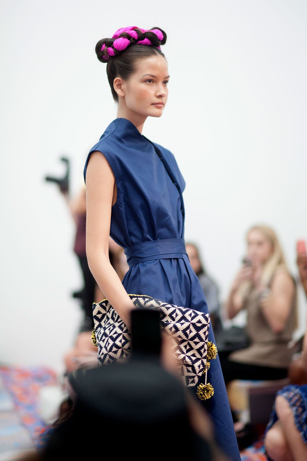 Inspired by a trip to Mexico and the ladylike, exaggerated shapes from the '40s, Cibani's spring '14 collection really cemented her POV: richly textured, organic shapes and materials, made with a homespun spin. It's a sensibility that sets her apart from the other indie-quirky NYC designers, and has produced a collection filled with pieces that are thrilling to wear but aren't in the least bit scary. Amongst a collection filled with signatures like asymmetrical hemlines and necklines, Cibani also experimented with all-consuming volume, which were more playful than somber. An obvious woven yarn motif and Frida Kahlo-type braids and brows really drove the Mexico theme home, but we most loved the simple sheath dresses and trousers with cheeky patchworks that'll help us creatively interject some whimsy into our work outfits (without the fear of getting pinged by HR).