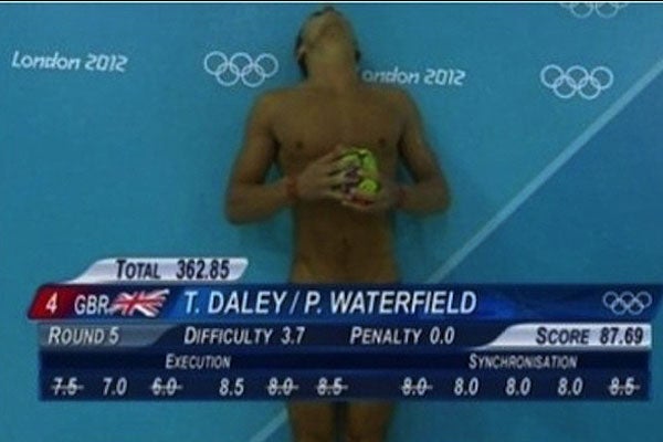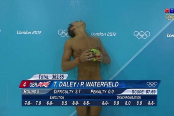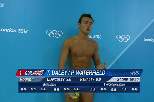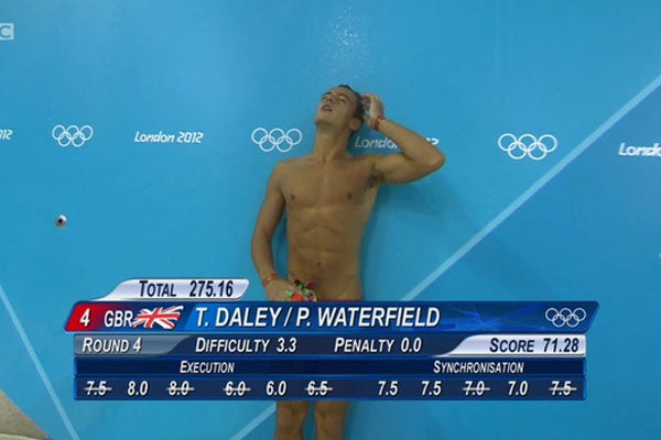 So, it appears that the Olympic broadcasters are giving us what we want, turning his post-dive shower into something that makes us need a (cold) shower, as well. A conveniently placed scoreboard obscures, erm, Daley's most sensitive area — which, to be honest, isn't all that hidden, thanks to a skimpy Speedo. But, when taken out of context, as done by these eagle-eyed Olympic watchers, Daley looks like he's giving a much more salacious show.
