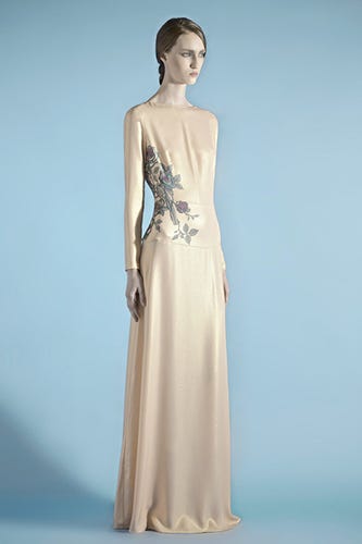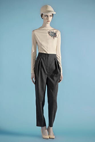The Russian designer has given ink a high-fashion touch with a collection of fair, nude bodysuits and dresses. Though the light fabric may only suggest "nudity" for a certain type of skin tone, on others, it would appear to be a blank, beige slate. Namely, one splashed with dark, twisted florals on the rib cage; lettering that runs down the sleeves; and other common, albeit typically more permanent, designs. As it turns out, though, this new kind of fashion tattoo is much less in your face than its Ed Hardy counterpart and a bit more thoughtfully placed. Take, for instance, the would-be chest tattoo that peeks out from under the lapel of a tailored, cropped pantsuit.