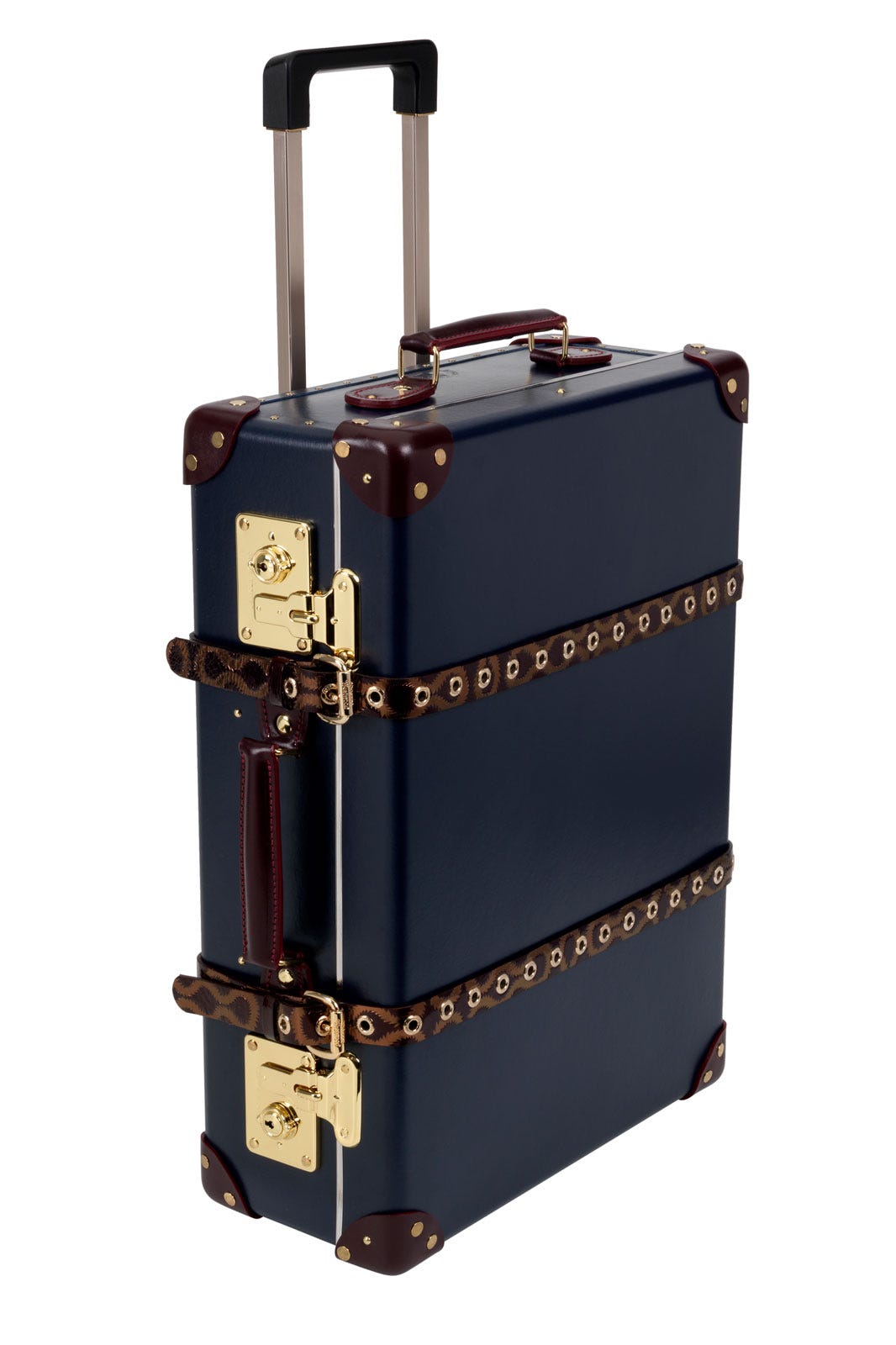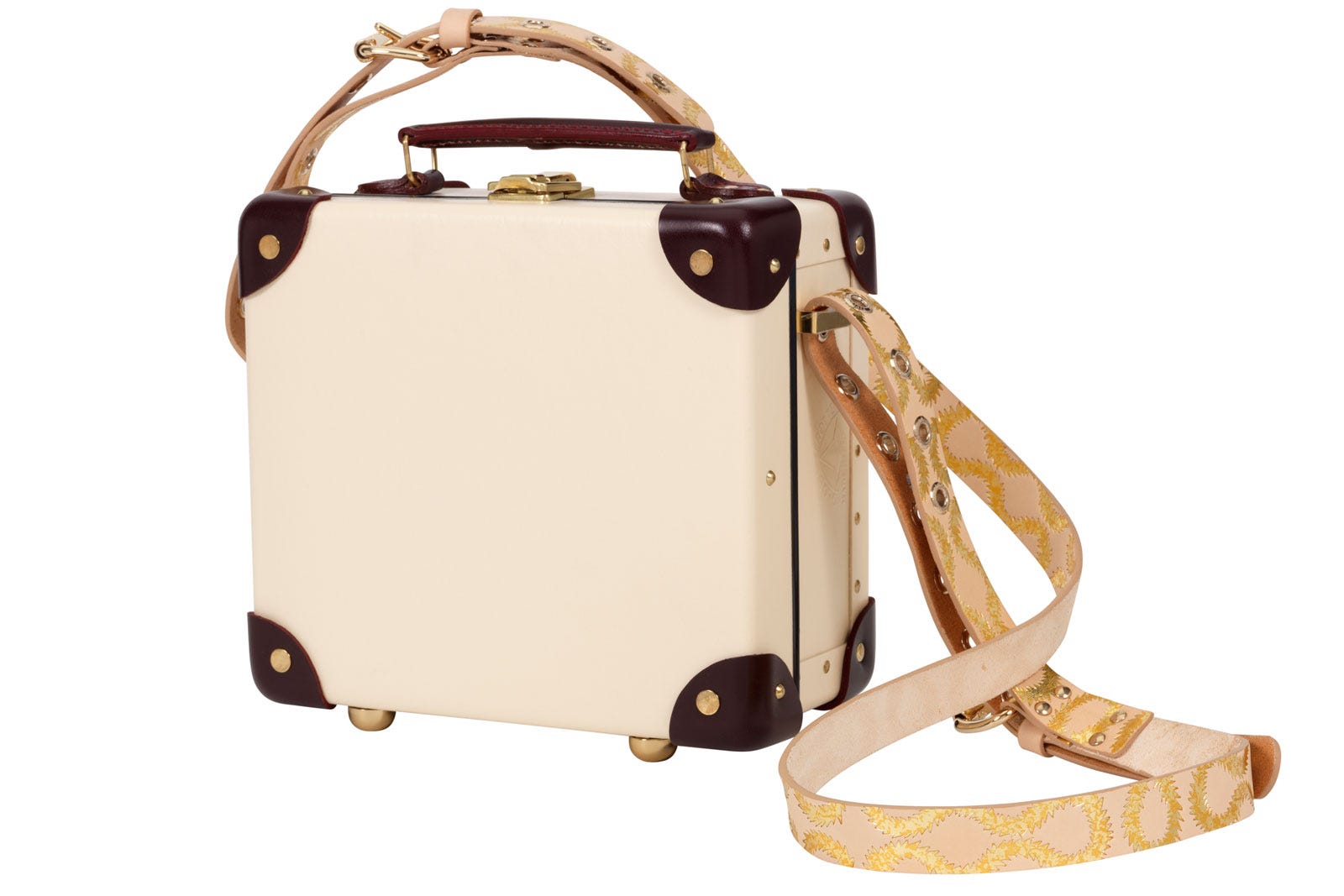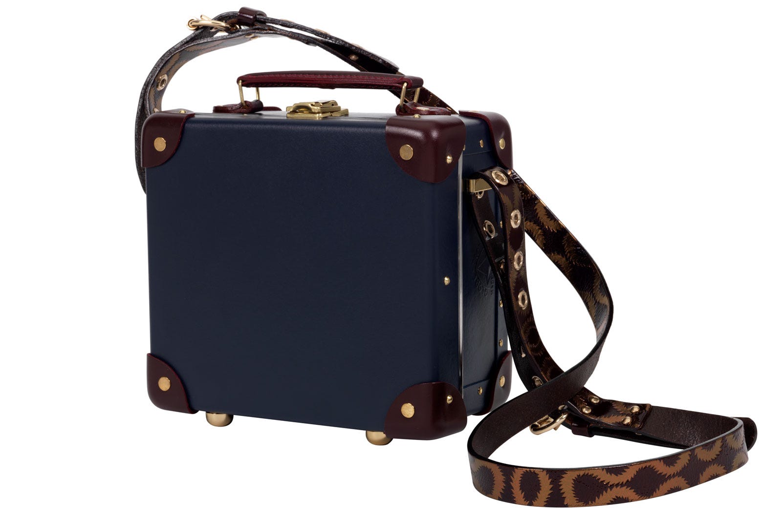 But, what we're really going crazy for are the Globe-Trotter luggage sets. Available in elegant cream or midnight blue, the handmade boxes are finished with burgundy-leather corners, polished brass, and Westwood's iconic squiggle print, which runs down the belts and shoulder straps. Sizes range from 30-inch suitcases with wheels, 21-inch trolley cases, and the nine-inch mini utility, with prices from $650 to $2,100.