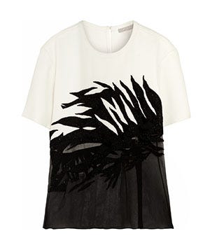 The black-and-white number from Jason Wu's resort '14 collection is basically the ultimate party blouse — sequins, sheer, and beading — that, surprisingly, doesn't go overboard in the sparkle department. If you don't have $3,320 to splurge on the designer original, try Topshop's tropical-print top as a cheaper alternative, and pair it with black slacks, strappy sandals, and a colorblock clutch. This getup proves that neutral looks can be just as interesting as their colorful counterparts. And, we'll definitely toast to that!